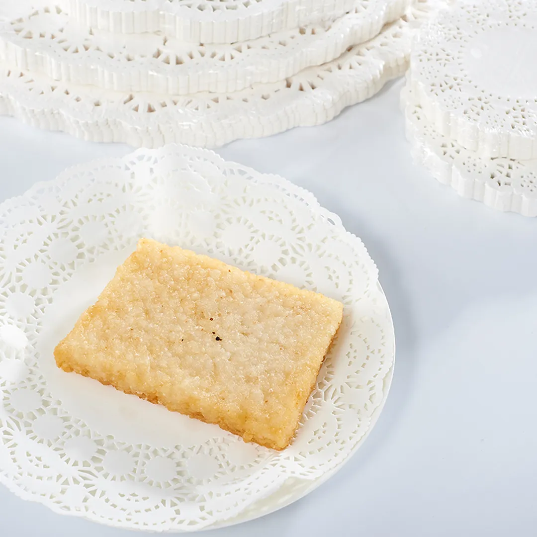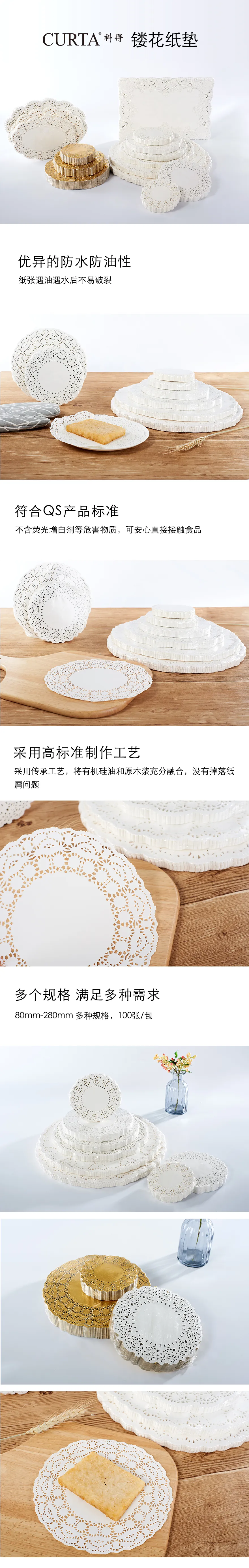 CURTA科得镂花纸垫采用高标准制作工艺,没有掉落纸屑问题。产品具有优异的防水防油性,纸张遇油遇水后不易破裂,不含荧光增白剂等危害物质,符合QS产品标准,可安心直接接触食品。