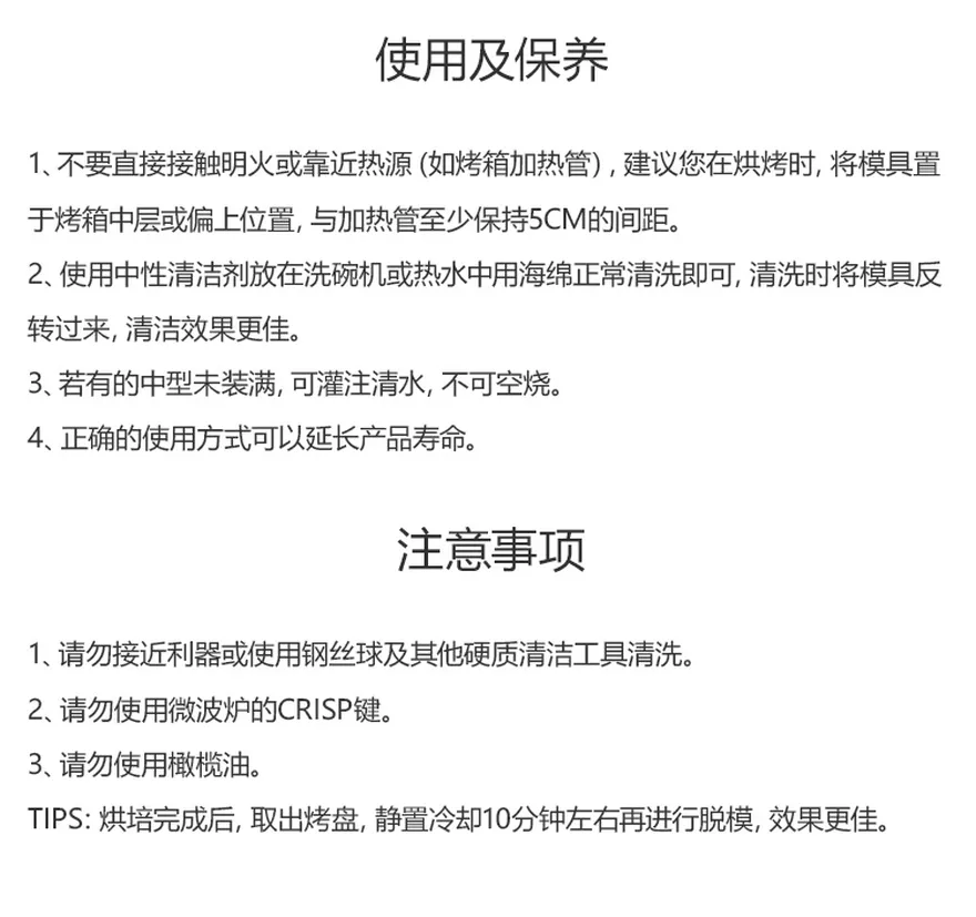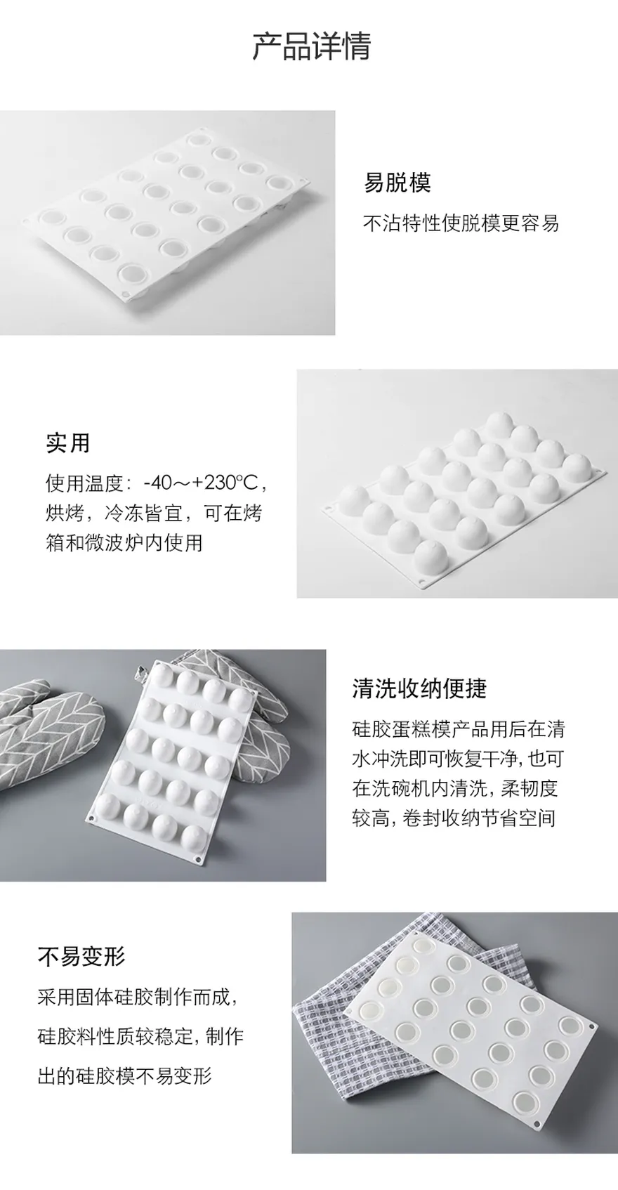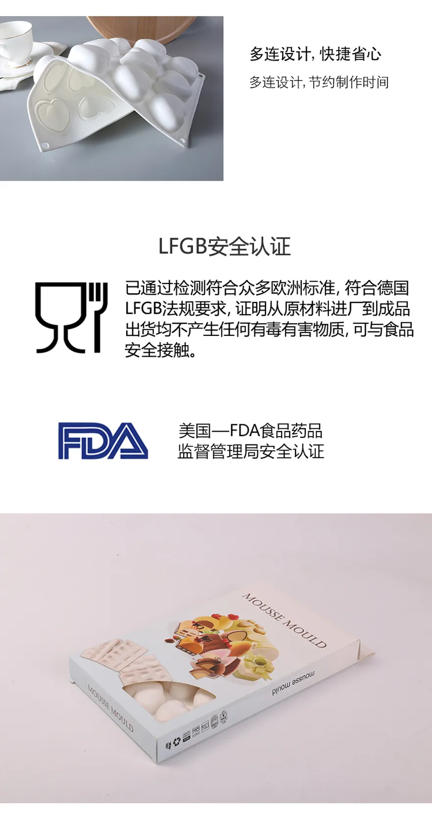 不沾特性使脱模更容易,更完美,安全卫生,寿命长。 产品用后在清水冲洗即可恢复干净,也可在洗碗机内清洗。 多连设计,节约制作时间。 美国FDA安全认证,已通过检测符合众多欧洲标准,符合德国LFGB法规要求。