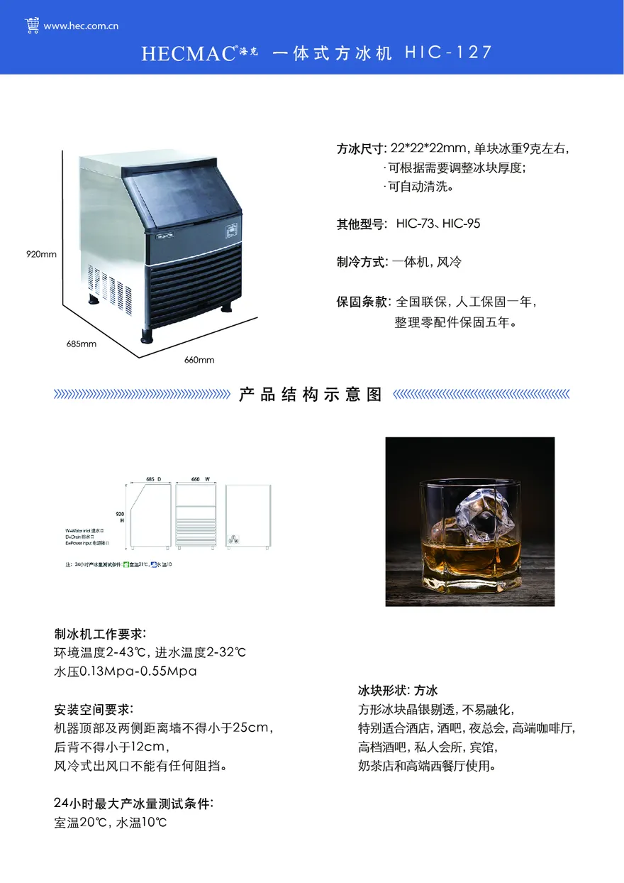 冰格数量:7*18;方冰尺寸:22*22*22mm,单块冰重9克左右;可根据需要调整冰块厚度。可自动清洗。制冷方式:一体机;风冷;全国联保,整机主要零部件5年保修(含压缩机、冷凝器蒸发器、制冰机水泵等),人工一年
