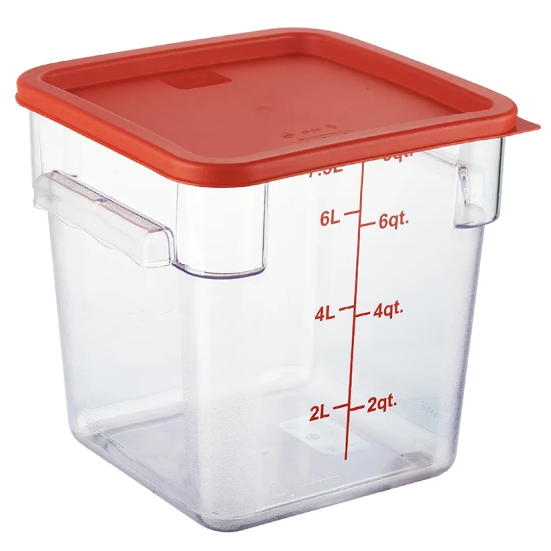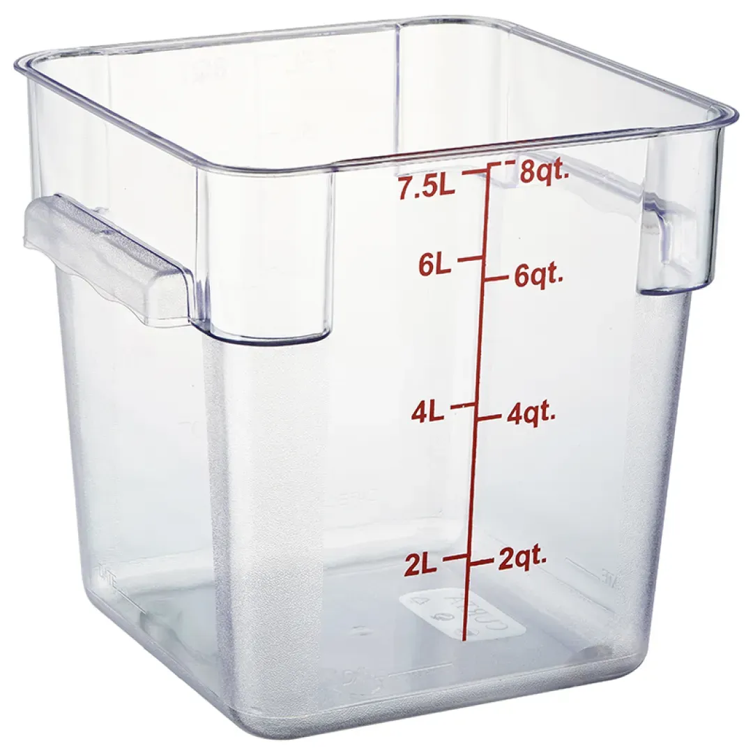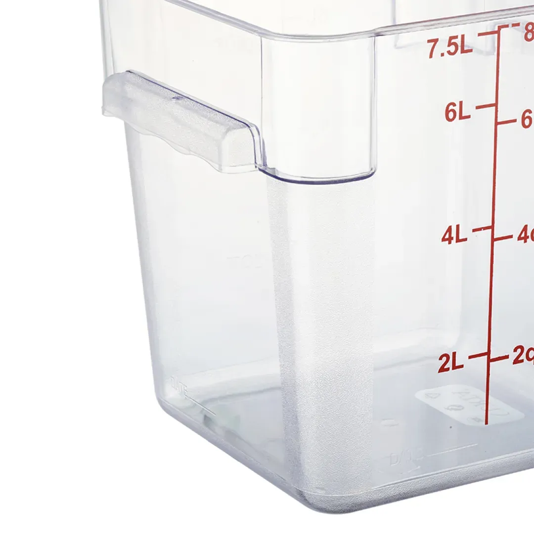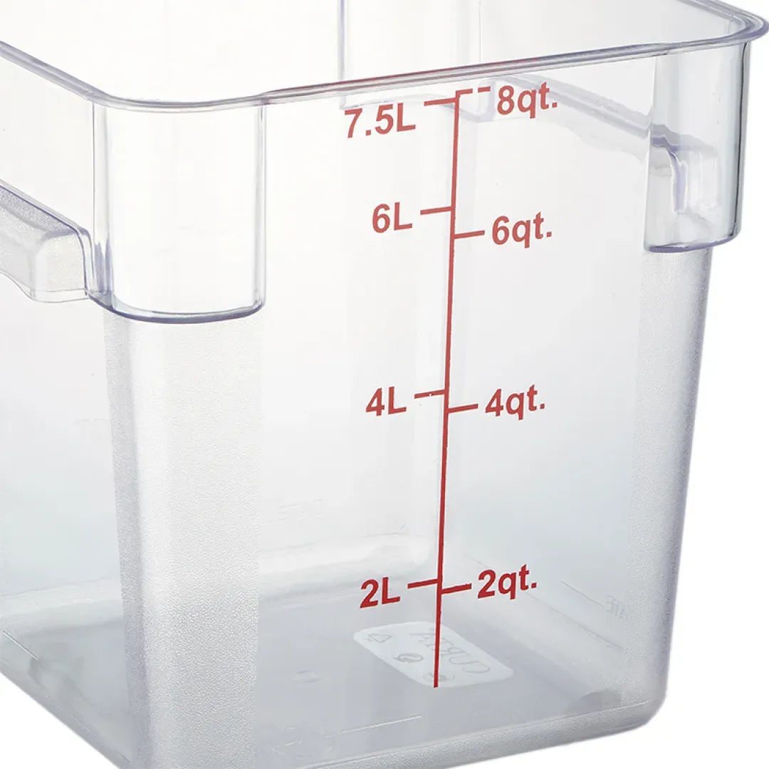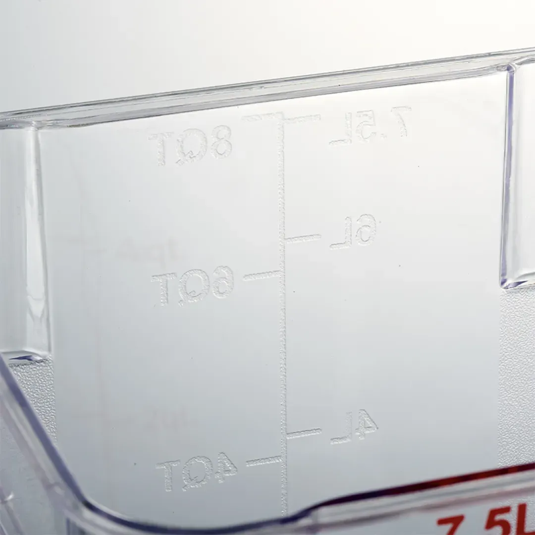 宽阔易提的把手,宽阔、舒适、止滑;可叠放凸角,堆叠不易卡住,增加支撑力稳定性;底部圆角设计,方便取物,容易清洗;容量标识,有QT和L两种单位;防滑表层,减少刮伤,增加使用年限,使用安全