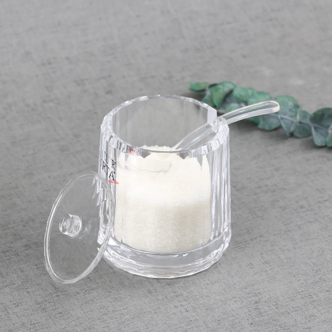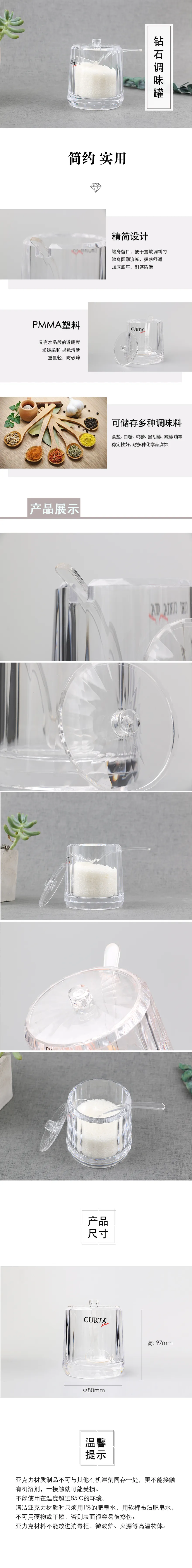 亚克力材质,盖上有缺口,可嵌入1把调味匙;适合盛放辣酱,果酱,调味酱等酱料;也适合盛放盐,糖等调味品;安全卫生,便于清洗,并有良好的牢固度