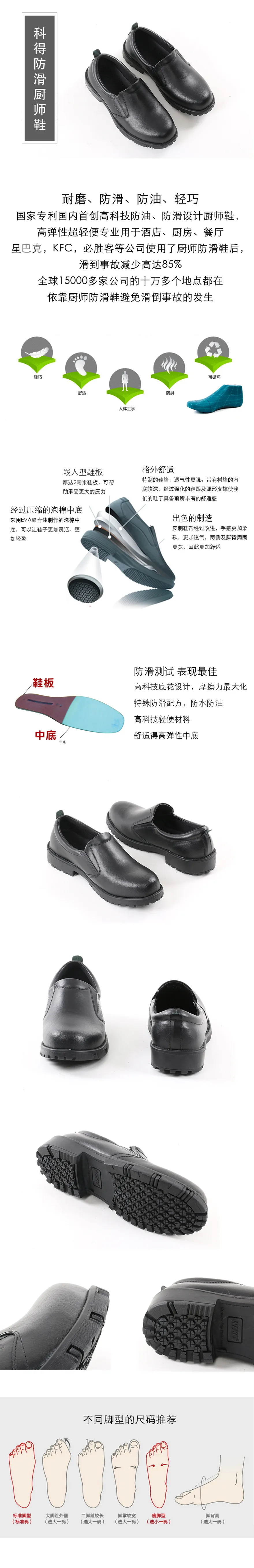 牛皮面料,大底为MD底;高科技底花设计,摩擦力最大化;特殊防滑配方,鞋底防水防油;特制的鞋垫,格外舒适 友情提示:本厨师鞋 鞋面为皮料材质 不具备防水特性 如鞋面皮料长时间遇水淋水 皮料可能会出现开裂现象 此不在质保范围